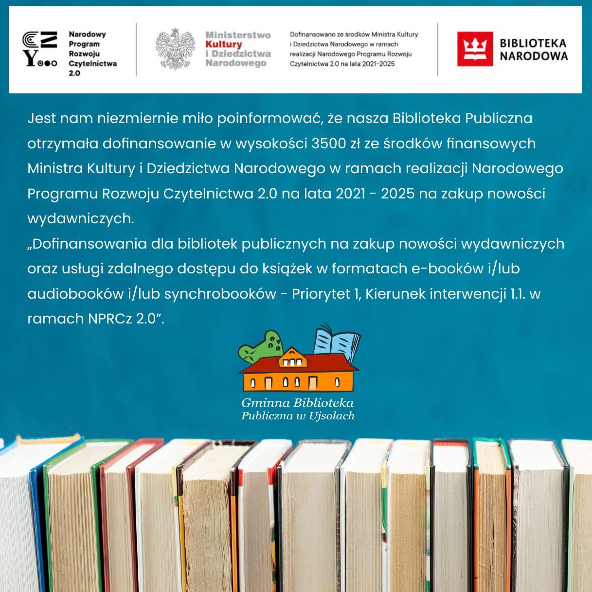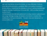 „Dofinansowania dla bibliotek publicznych na zakup nowości wydawniczych oraz usługi zdalnego dostępu do książek w formatach e-booków i/lub audiobooków i/lub synchrobooków - Priorytet 1, Kierunek interwencji 1.1. w ramach NPRCz 2.0”.